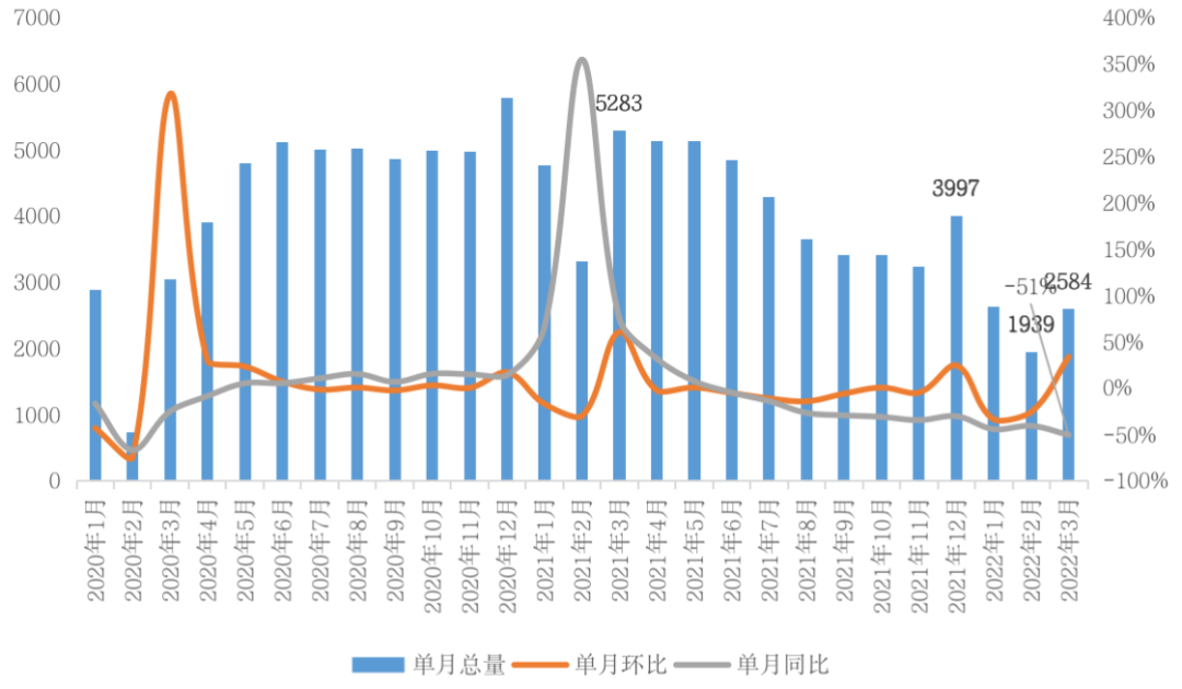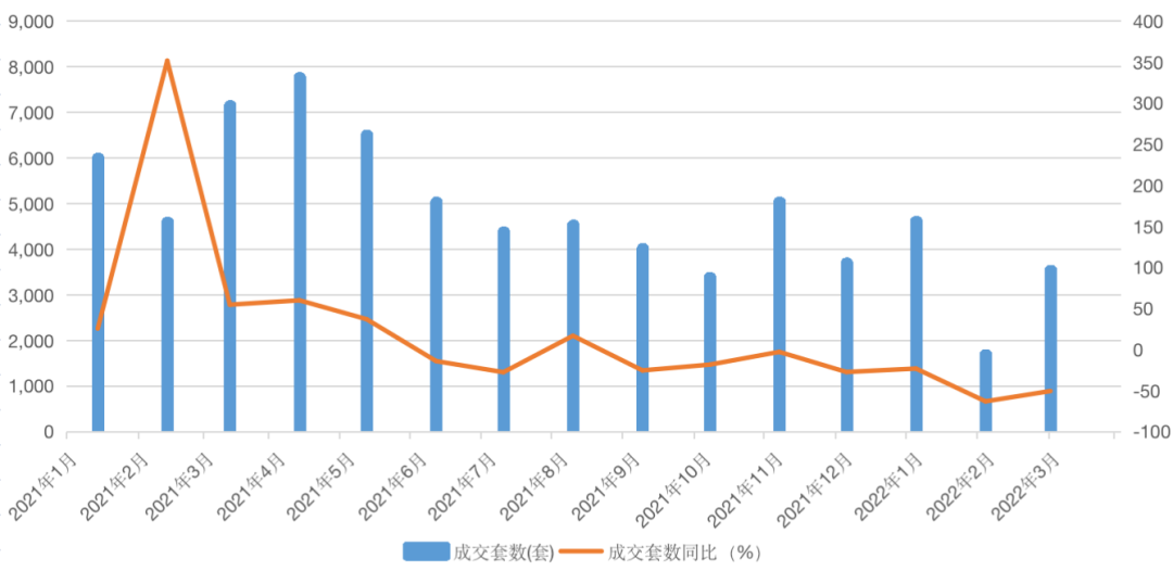 從月度數據來看,2022年1月共成交4614套,2月成交1698套,3月僅成交3541套,其中2月成交套數同比下降超六成。