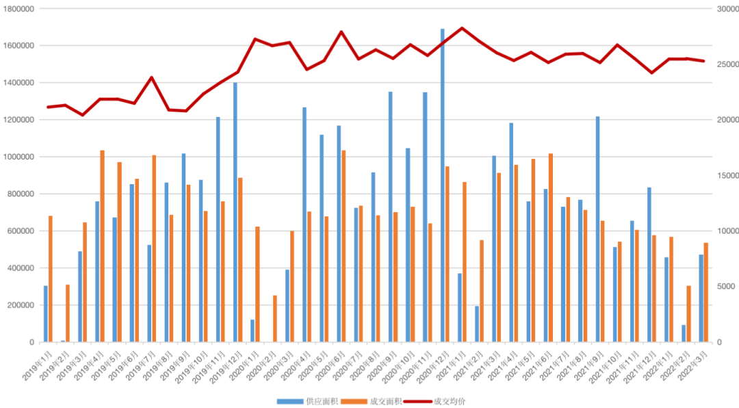 圖:2019年1月至2022年3月蘇州新建商品住宅供求量價(單位:平方米、元/平方米)