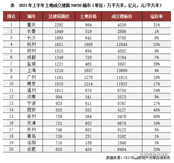 聯系市場熱度來看,長三角區域的土拍熱度明顯較高。徐州、鹽城、寧波、杭州、溫州、合肥等城市的溢價率在優質土地出讓的帶動下都超過了20%,其中徐州上半年平均成交溢價率更是高達60%,在成交量前20城市中溢價率排第一,其中銅山區土地單價紀錄更是在今年刷新,土拍熱度由此可見一斑。此外,西安、重慶等中西部城市在熱點區域優質土地大量入市的帶動下,溢價率均超30%,不過這些城市多是一些地價水平較低的城市,總的來看,市場熱度不及限價嚴苛的長三角區域。