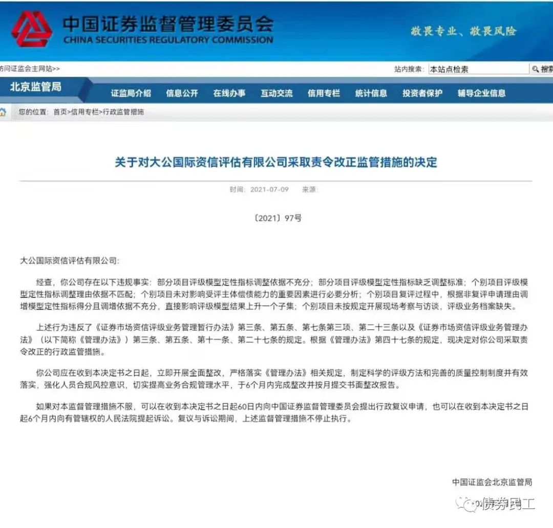 根據(jù)中國證監(jiān)會北京監(jiān)管局2021年7月9日披露的信息,大公國際資信評估有限公司(以下簡稱“大公國際”)被采取責令改正監(jiān)管措施,主要原因是部分項目評級模型定性指標調(diào)整依據(jù)不充分、缺乏調(diào)整標準等,要求于6個月內(nèi)完成整改并提交書面整改報告。