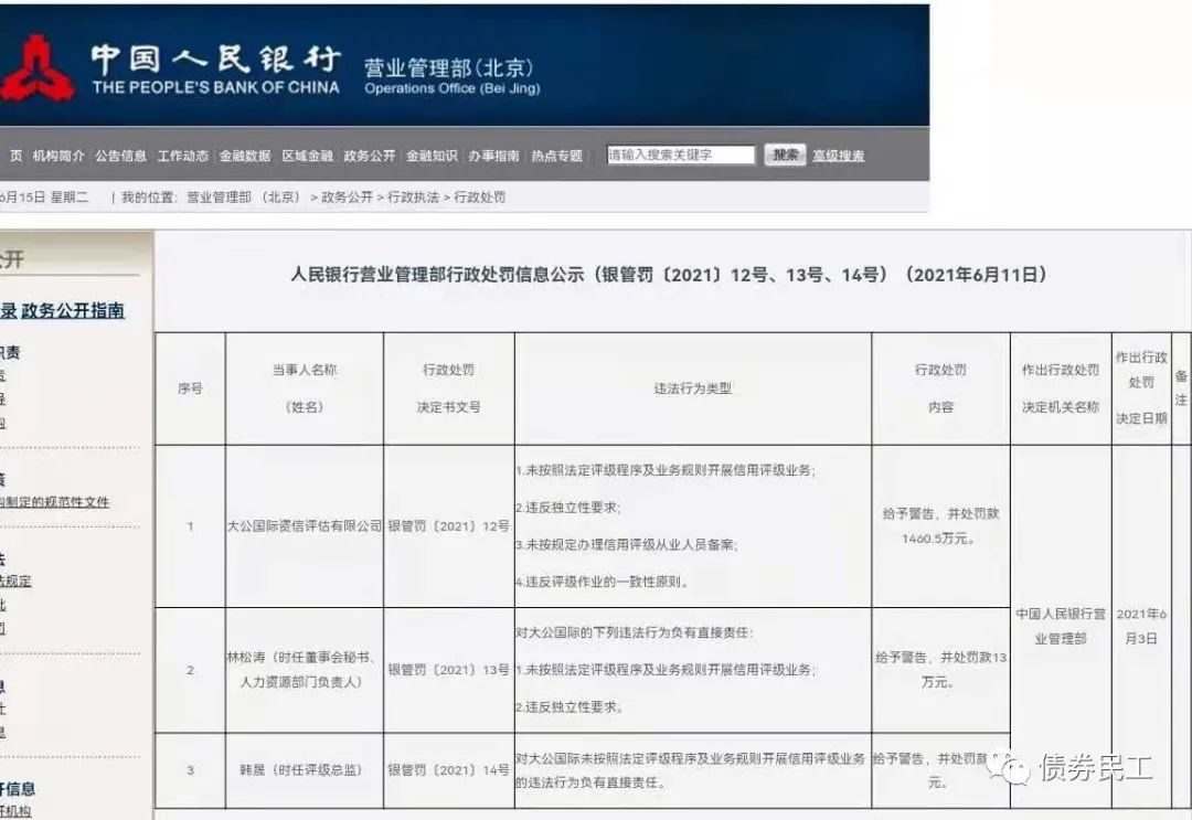 這是大公國際2021年第二次收到評級監(jiān)管機構的處罰了。此前根據(jù)中國人民銀行營業(yè)管理部2021年6月的公告,大公國際被罰款1460.50萬元,主要原因是未按照法定程序開展評級業(yè)務、違反獨立性要求和違反評級作業(yè)的一致性原則等。值得注意的是,中國人民銀行營業(yè)管理部的在此次觸發(fā)中,被處罰人還包括大公國際的評級總監(jiān)和董事會秘書。