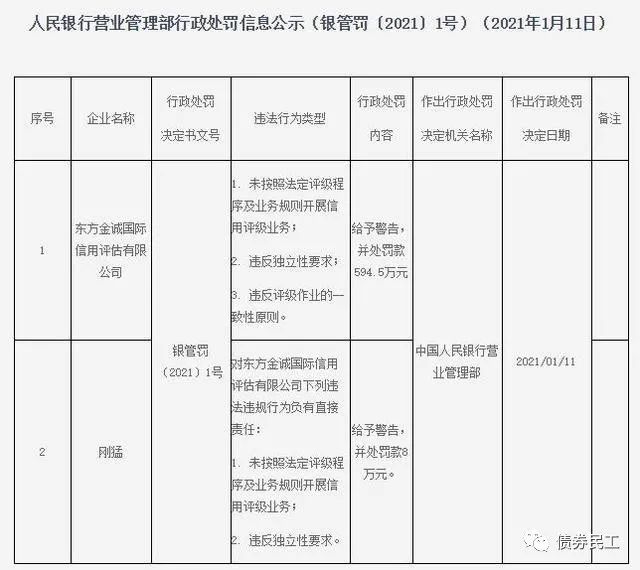 3、中國人民銀行營業(yè)管理部于2021年1月11日對東方金誠給予警告并罰款594.5萬元,主要原因是未按照法定評級程序及業(yè)務規(guī)則開展信用評級業(yè)務、違反獨立性要求和違反評級作業(yè)的一致性原則。