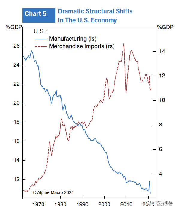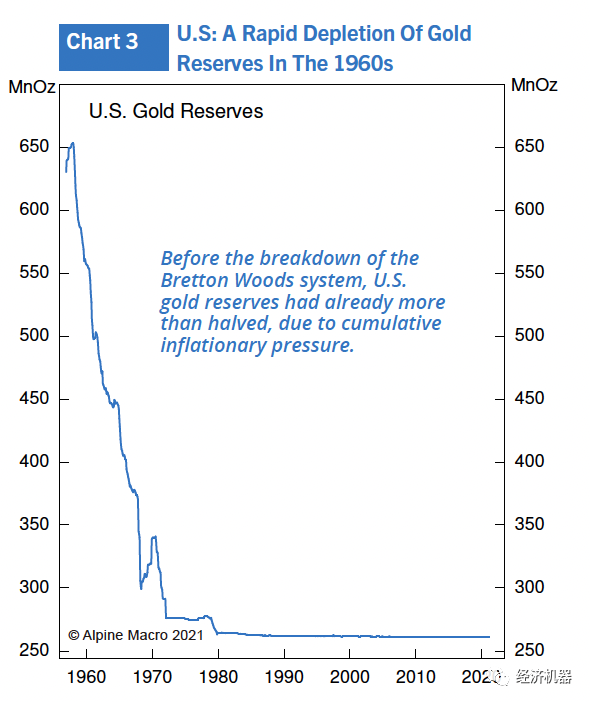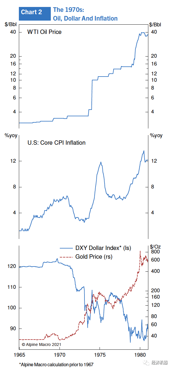 Alpine Macro在很多研究報告中呼吁這種擔憂過分了。我們一起看看20世紀70年代的通脹經歷,當年所發生的事情無疑是《華爾街日報》提到的“大時代轉折點”。我相當清楚地記得那一幕,1960年代我曾在加拿大銀行工作,當時的情況為1970年代的大通脹打下了基礎。