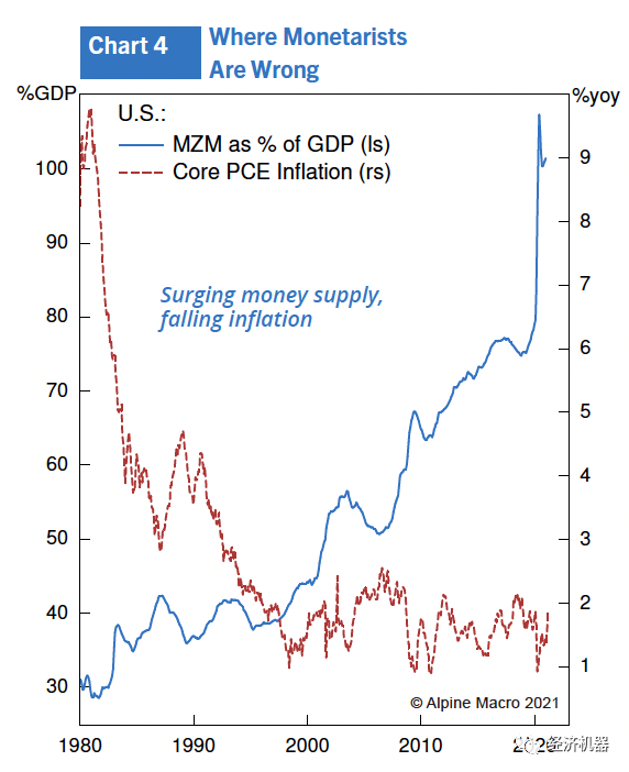 在20世紀80年代的大部分時間里,貨幣供應量(MZM)強勁增長(圖4)。米爾頓·弗里德曼的貨幣主義思想仍然很流行。在整個1980年代,對通脹的擔憂仍然普遍存在。然而,該模型存在嚴重缺陷,因為自沃爾克時代以來,貨幣流通速度穩步下降,吸收了大部分貨幣供應的增長。