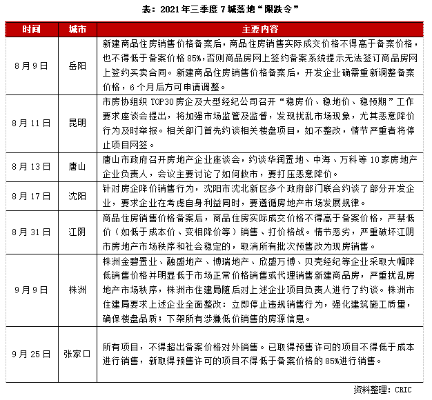 出于穩(wěn)房價、穩(wěn)預(yù)期的需要,岳陽、昆明等7城相繼落地“限跌令”。其中,岳陽、江陰明文規(guī)定禁止大幅降價,昆明、唐山、沈陽、株洲采取約談的方式,禁止房企、中介機(jī)構(gòu)惡意降價、打價格戰(zhàn),擾亂房地產(chǎn)市場秩序。