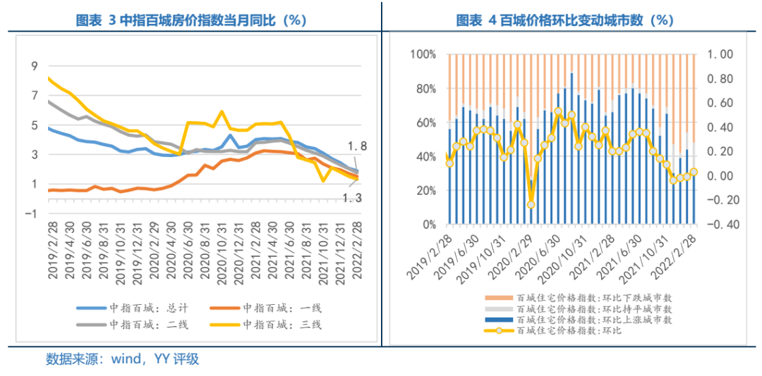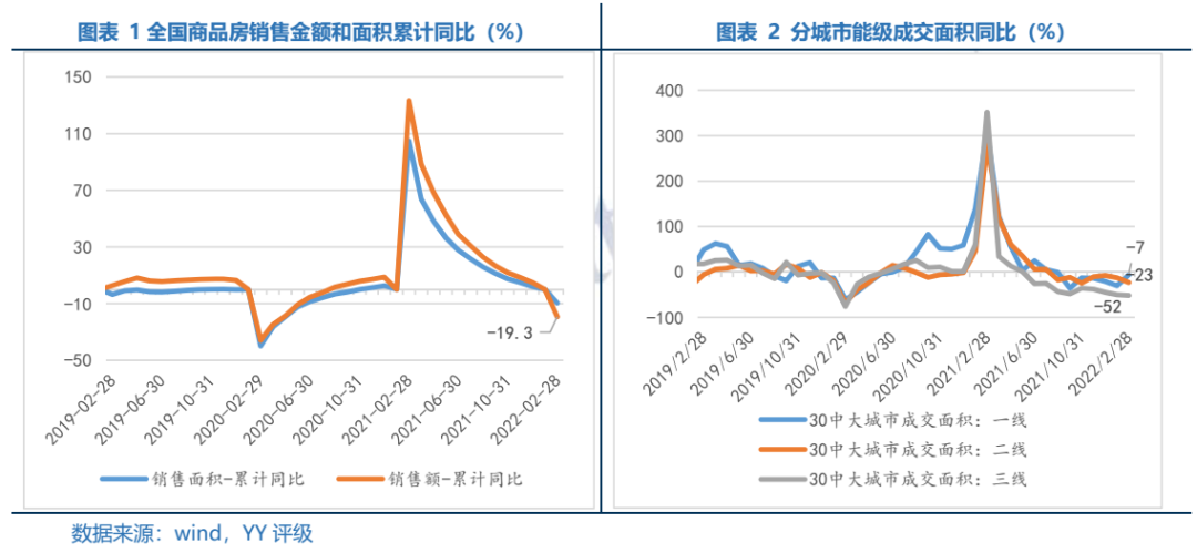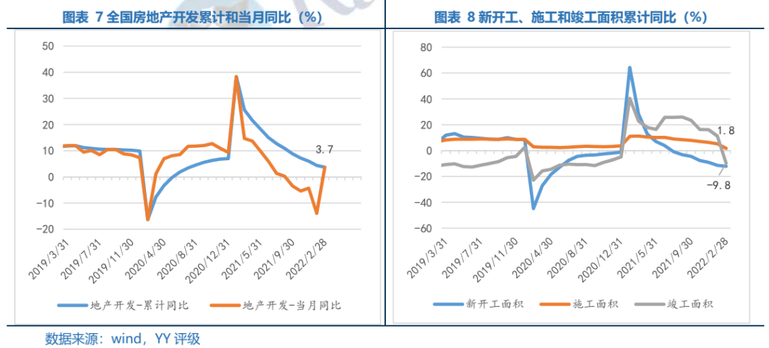 22年1-2月全國房地產開發投資累計同比上升3.7%,較21年1-12月下降0.7pct,當月同比上升3.67%,較21年12月增加17.58pct。我們認為在土地購置費占比減少的當前開發構成中,可能更多依賴原材料上漲拉升施工增長。結合新開工、施工和竣工面積累計同比仍在下滑,分別較21年1-12月下降0.8pct、3.4pct和21.0pct,故成本端的上漲而非真實投資面積的增長使得開發投資繼續超預期的可持續性較弱。