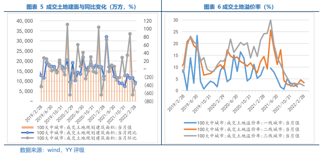 根據銷售-拿地-開工投資的經營流程鏈條,在銷售大幅下滑的情況下土地市場同樣降溫顯著。22年2月份百城土地成交建面6846.6萬方,當月同比和環比分別為-33.4%、-36.8%。一方面由于2月春節因素,土地供應規模有所下滑,另一方面從成交土地溢價率看,疫情和經濟放緩周期下土拍市場表現冷清,二三線土地溢價率繼續回落。后續隨著土地供應在3-4月份集中出讓,土地成交建面料會有所抬升,但實質拿地熱情度的回升,還需結合銷售、市場預期、企業盈利等。
