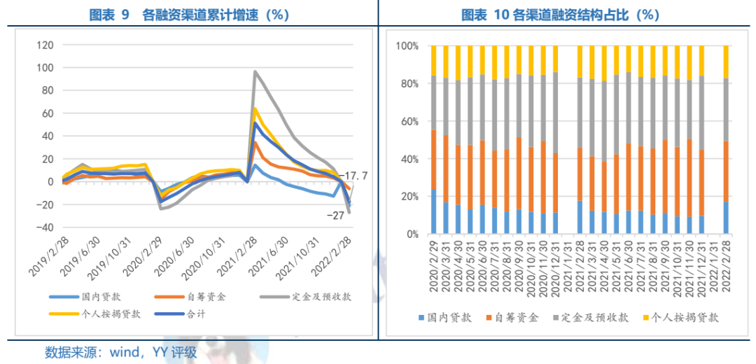融資負債端看,資金來源規模收縮表現出較大的不穩定性。22年1-2月資金來源同比下降17.7%,較21年1-12月-21.9pct。具體渠道看,貸款、自籌資金、預收款和個人按揭分別同比-21.1%、-6.2%、-27.0%和-16.9%,分別較21年1-12月-8.4pct、-9.4pct、-38.2pct和-24.9pct。其中受銷售持續大幅下滑的影響,資金來源占比最大的經營性回款(即預收款和個人按揭)下滑幅度最大,其次為自籌和銀行貸款。資金鏈壓力仍在加劇,銀行、信托等抽貸部分民企,再融資市場幾乎冰封,進一步讓更多投資者選擇撤回,負循環加速。