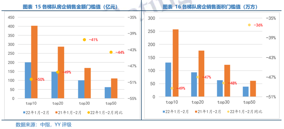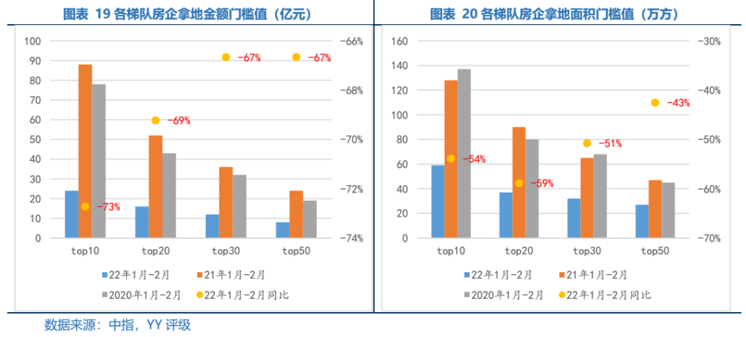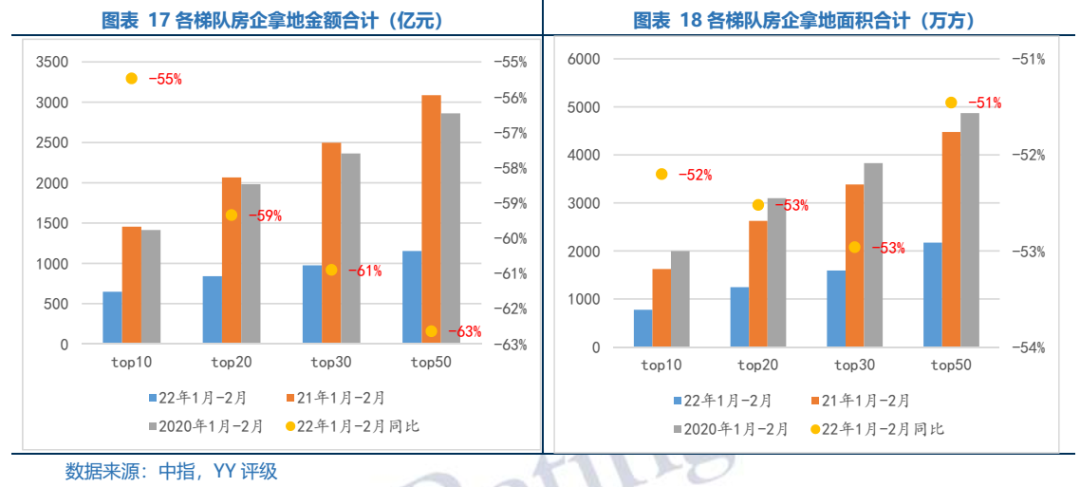 2022年1-2月全國TOP50房企各梯隊拿地金額門檻同比下滑幅度均超43%,top10拿地面積僅59萬平方米,下滑了54%、top20拿地面積僅32萬平方米,下滑了59%、top30拿地面積僅27萬平方米,下滑了51%和top50拿地面積僅21萬平方米,下滑了43%。