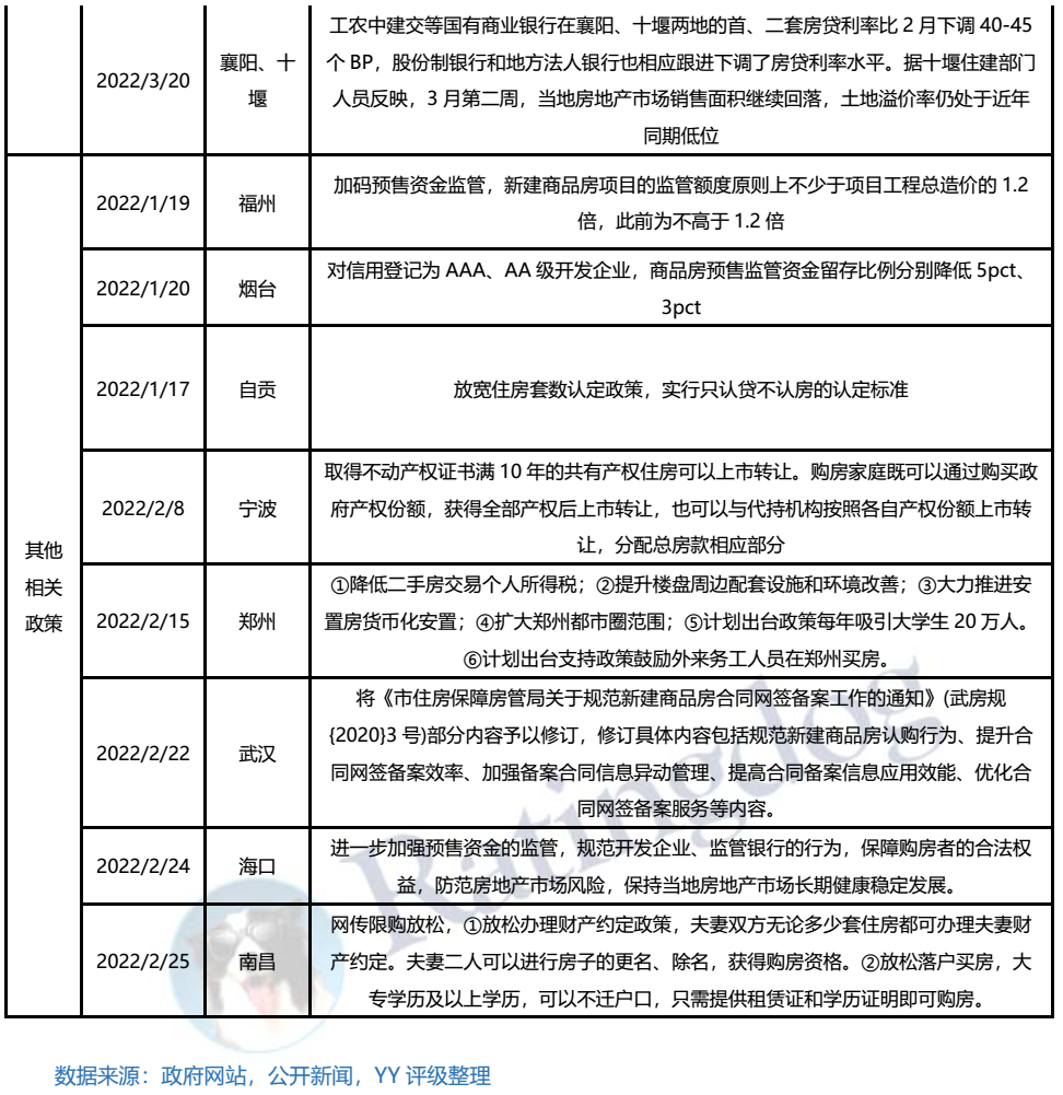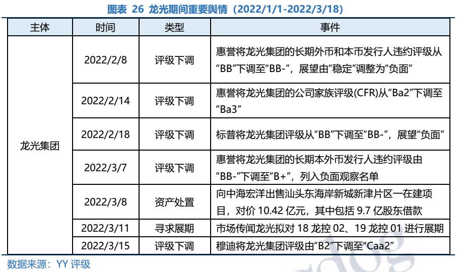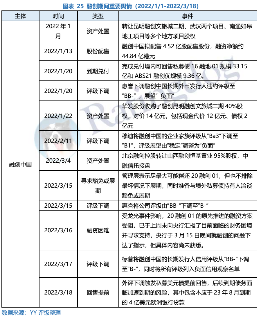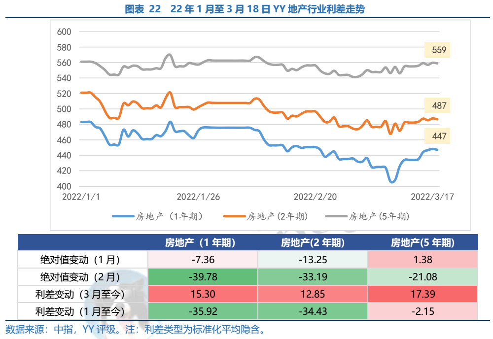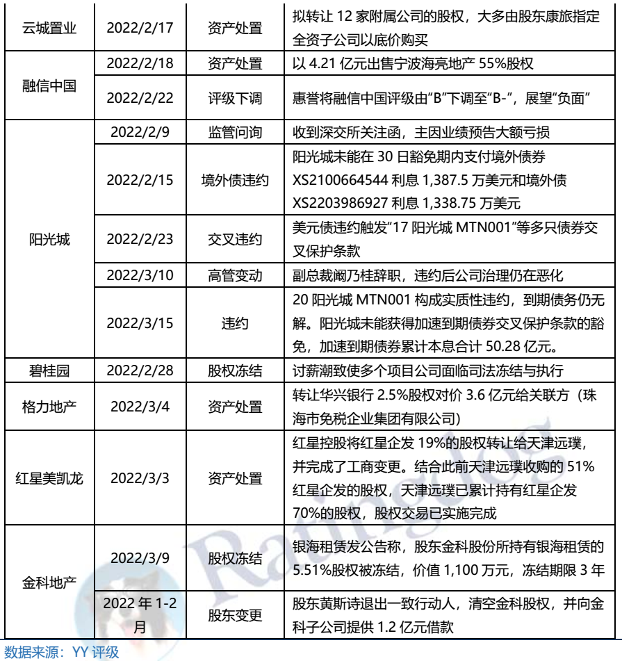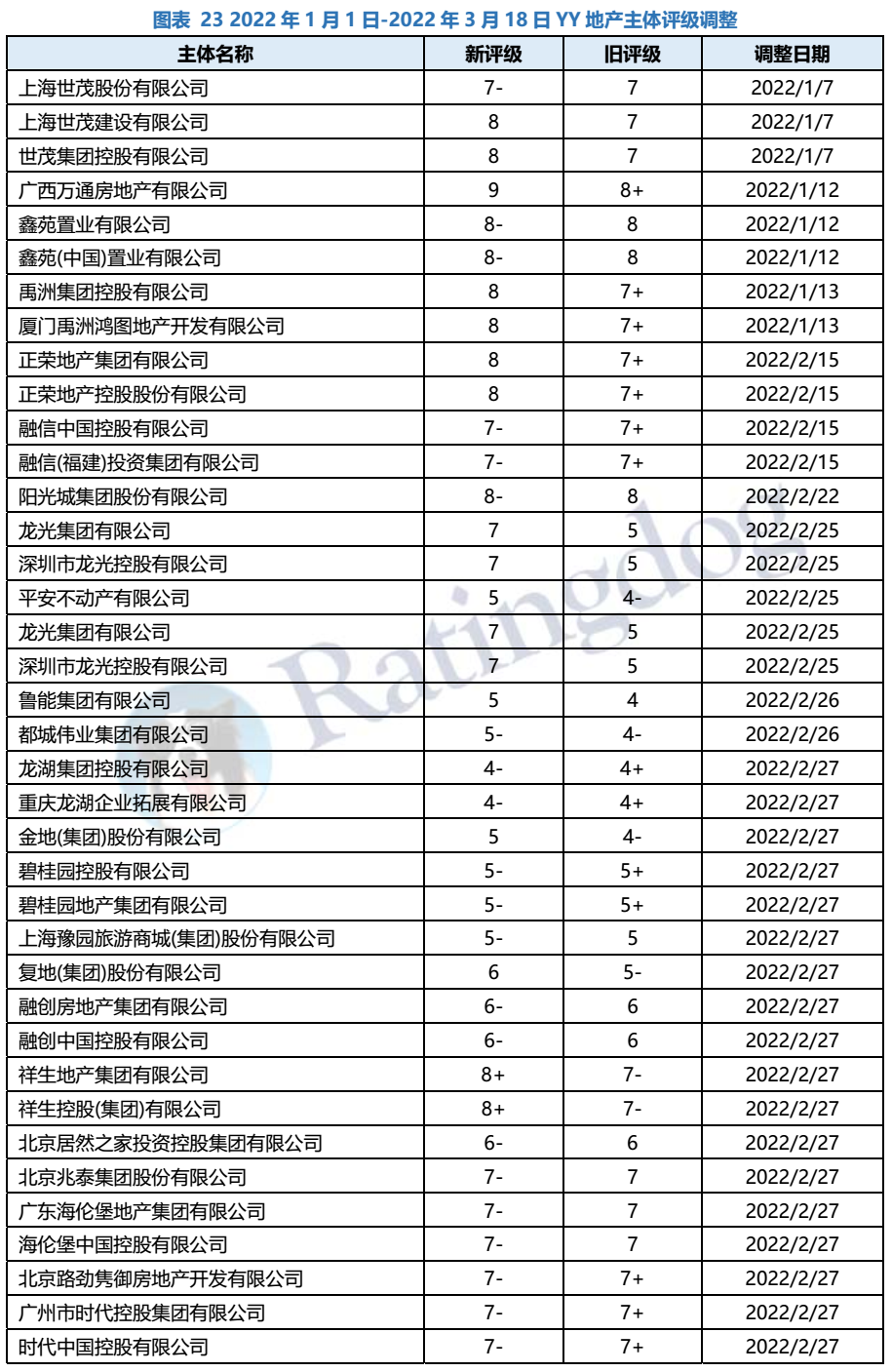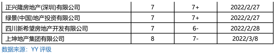 2022年1月1日至3月18日,YY評級綜合評估行業基本面、個體信用資質及負面輿情等因素,下調42家地產主體評級,即包括目前面臨流動性或再融資困境的民營房企,也包括經營能力較弱的央企/國企地產主體。