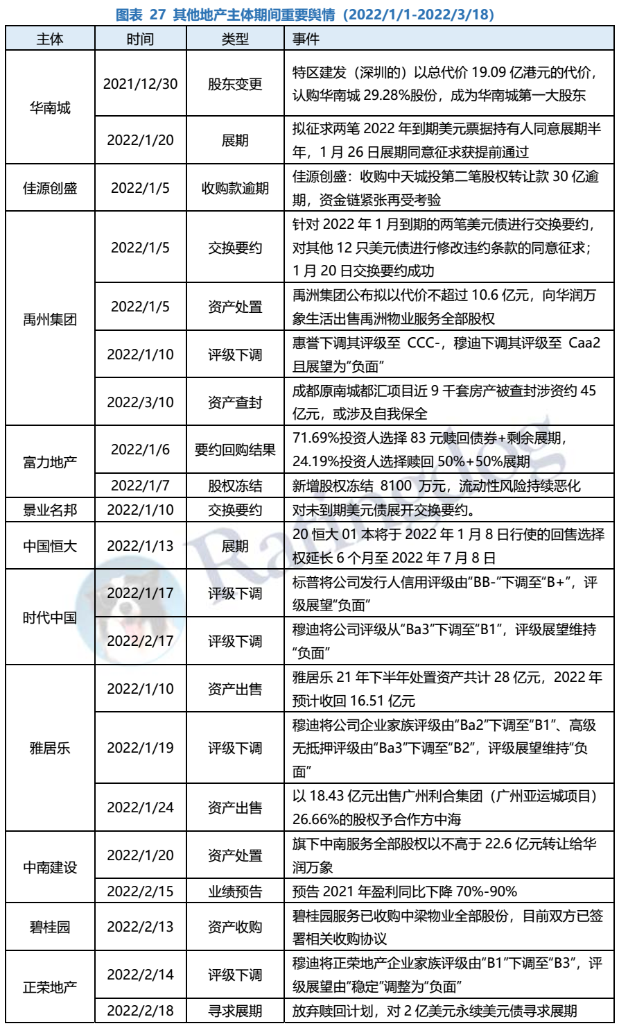 整體來看,2022年1月1日-3月18日,在行業銷售下行、外部評級下調及再融資受困等多重不利因素之下,各地產民企招式盡出,但仍止不住負面輿情發酵,違約/展期已由高杠桿弱資質主體蔓延至此前市場認為相對資質尚可的主體,。