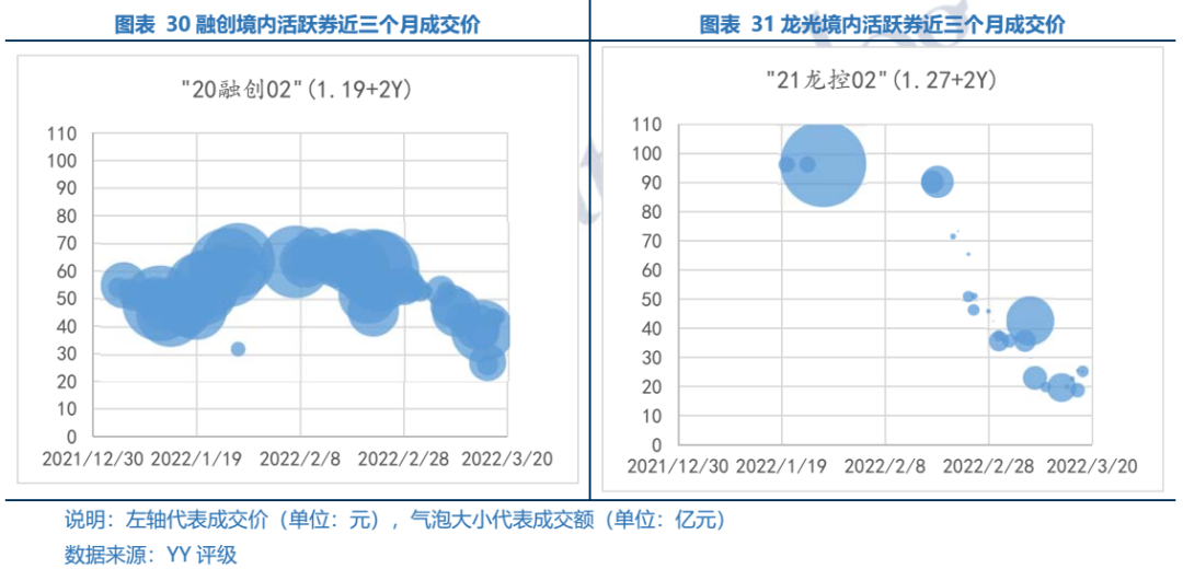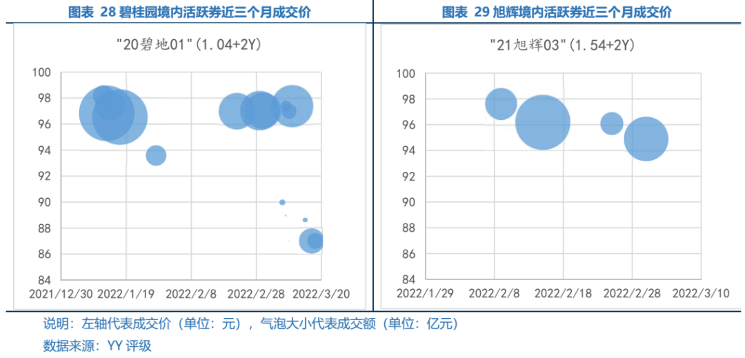 我們選取碧桂園、旭輝、融創和龍光期限相近的境內債券,觀察2022/1/1-2022/3/18期間成交情況,不同資質主體價格分層明顯。“21旭輝03”成交在94元以上;受龍光展期事件影響,“20碧地01”遭砸盤,價格由95元以上跌至87元。因債券展期消息,融創和龍光境內債遭血洗,其中“20融創02”被大量拋售,價格跌至30元以下,“21龍控02”價格最低被砸至20元以下。
