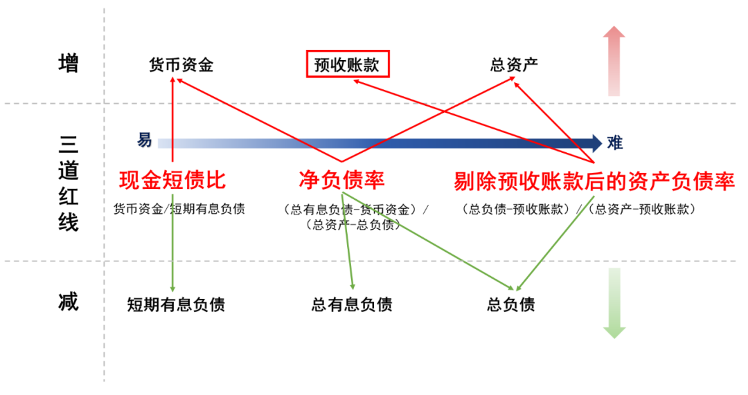 事實(shí)上,房企降檔之所以呈現(xiàn)“現(xiàn)金短債比-凈負(fù)債率-剔除預(yù)收款后的資產(chǎn)負(fù)債率”這樣的順序,主要與指標(biāo)改善的難易程度掛鉤。