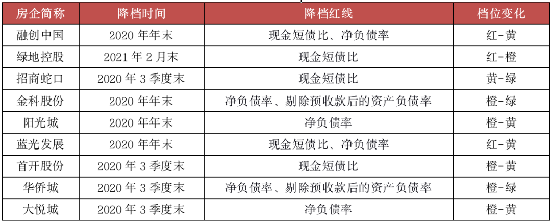 據(jù)統(tǒng)計(jì),目前已有多家房企成功降檔,截止至2020年三季度,招商蛇口、首開股份、華僑城、大悅城等房企成功降檔;截止至2020年年底,融創(chuàng)、金科、陽光城、藍(lán)光等房企成功降檔;2021年2月末,綠地稱提前“轉(zhuǎn)綠”達(dá)標(biāo)。