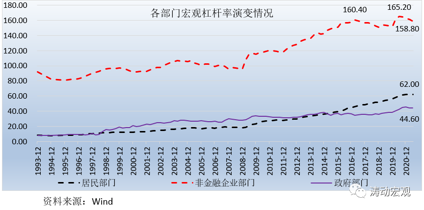 宏觀杠桿率是指非金融企業(yè)部門(mén)、政府部門(mén)、住戶部門(mén)從金融體系(含金融市場(chǎng)和金融機(jī)構(gòu))獲得的債務(wù)余額與年度國(guó)內(nèi)生產(chǎn)總值的比例,這是防范化解金融風(fēng)險(xiǎn)的決策依據(jù)。中國(guó)社科院國(guó)家資產(chǎn)負(fù)債表研究中心每季度會(huì)公布各部門(mén)的杠桿率情況,當(dāng)然央行自身也會(huì)對(duì)各部門(mén)的宏觀杠桿率進(jìn)行測(cè)算(通常不會(huì)公布)。
