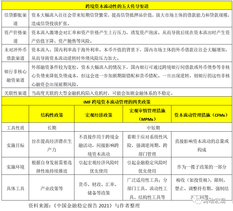 在金融雙向開(kāi)放步伐不斷加快的背景下,短期跨境資本逐利性、易超調(diào)和順周期性等特點(diǎn)很容易刺激金融機(jī)構(gòu)過(guò)度承擔(dān)風(fēng)險(xiǎn)、加劇金融體系脆弱性、放大宏觀經(jīng)濟(jì)波動(dòng),而央行和外管局近年亦均特別強(qiáng)調(diào)突出跨境資本流動(dòng)可能帶來(lái)的風(fēng)險(xiǎn)防范問(wèn)題(詳情請(qǐng)參見(jiàn)央行和外管局2021年度會(huì)議釋放哪些信號(hào)?),并于2017年提出了“宏觀審慎+微觀監(jiān)管”兩位一體的跨境資本流動(dòng)宏觀審慎管理框架。鑒于此,《中國(guó)金融穩(wěn)定報(bào)告2021》亦專(zhuān)門(mén)討論“跨境資本流動(dòng)對(duì)金融穩(wěn)定的影響”。