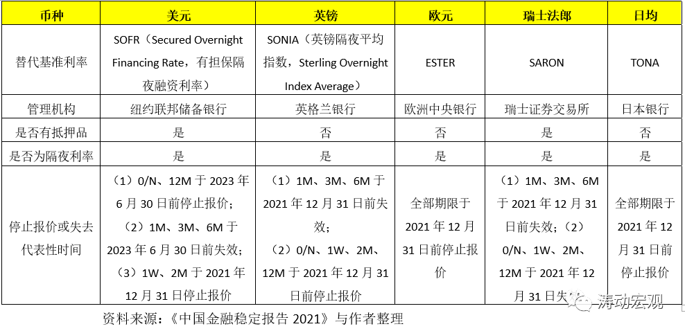3、目前主要發(fā)達(dá)經(jīng)濟(jì)體已基本完成了替代基準(zhǔn)利率的遴選工作,即它們大多采用基于實(shí)際交易、單一隔夜期限的無(wú)風(fēng)險(xiǎn)基準(zhǔn)利率(RFRs)作為IBOR類(lèi)基準(zhǔn)利率的替代。當(dāng)然,歐元區(qū)、日本等經(jīng)濟(jì)體允許多個(gè)基準(zhǔn)利率同時(shí)存在。