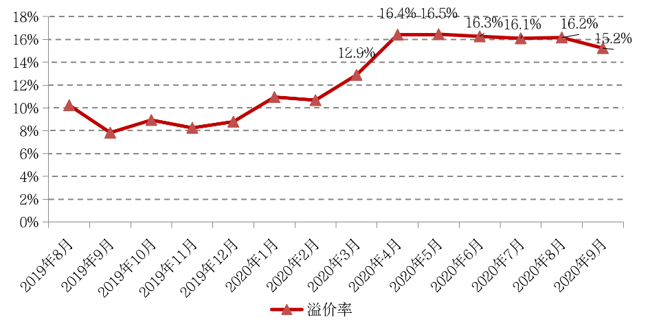 CRIC監(jiān)測(cè)數(shù)據(jù)顯示,9月的溢價(jià)率環(huán)比8月下降1個(gè)百分點(diǎn),降至15.2%,并創(chuàng)下今年4月以來(lái)新低。