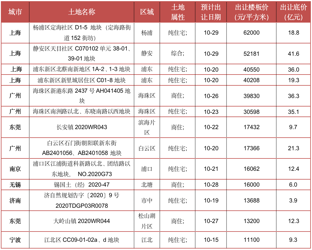 上海、東莞、重慶、成都、杭州、無(wú)錫、濟(jì)南也有多宗優(yōu)質(zhì)地塊值得關(guān)注。上海優(yōu)質(zhì)地塊供應(yīng)幅數(shù)達(dá)到了8宗,楊浦東外灘、靜安天目社區(qū)兩地塊起拍樓板價(jià)均超5萬(wàn)元/平方米,尤其是東外灘的定海社區(qū)D1-5地塊起拍樓板價(jià)高達(dá)6.2萬(wàn)元/平方米,已經(jīng)接近7月份龍光競(jìng)得的一街之隔的土地的成交價(jià)65440元/平方米,除此之外,浦東北蔡、三林板塊也有優(yōu)質(zhì)舊改地塊出讓?zhuān)鹋膬r(jià)均在4萬(wàn)元/平方米以上。