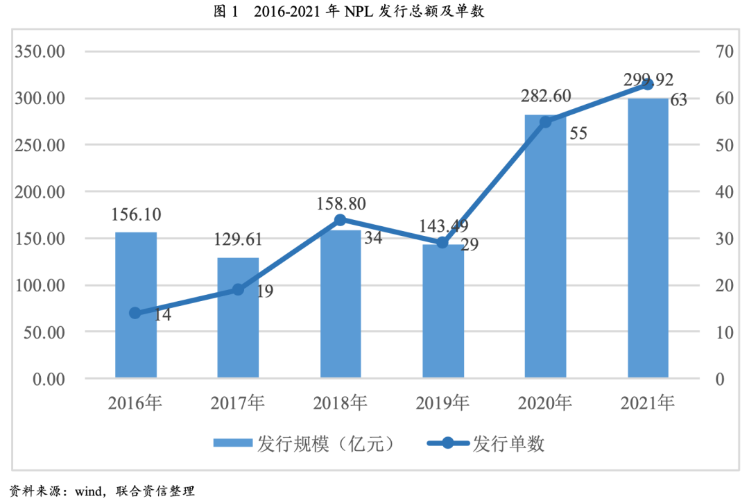 2016年至2021年,不良資產證券化產品(以下簡稱“NPL”)累計發行規模為1170.54億元。繼2020年不良資產證券化產品發行量大幅提升后,2021年,銀行間公募市場共發行63單不良資產證券化產品,較上年增加8單,發行規模達299.92億元,同比增長6.13%,發行規模穩中有升。