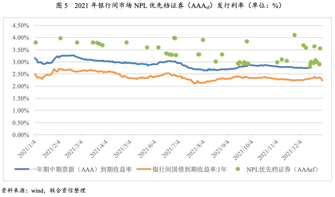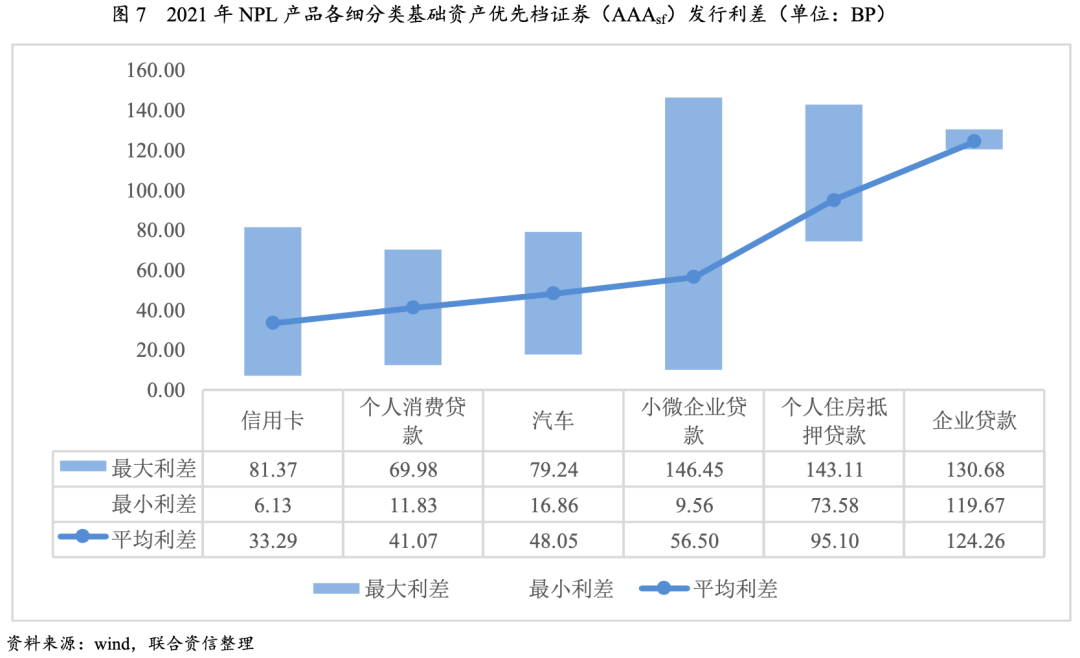 2021年,NPL優先檔證券(AAAsf)發行利率高于一年期中期票據(AAA)發行利率6.13-146.45BP。其中,基礎資產為信用卡、個人消費型NPL產品,優先檔證券(AAAsf)發行利差較小,為6.13-81.37BP,平均利差34.35BP;基礎資產為企業貸款的發行利差最大,為119.67-130.68BP,平均利差124.26BP。