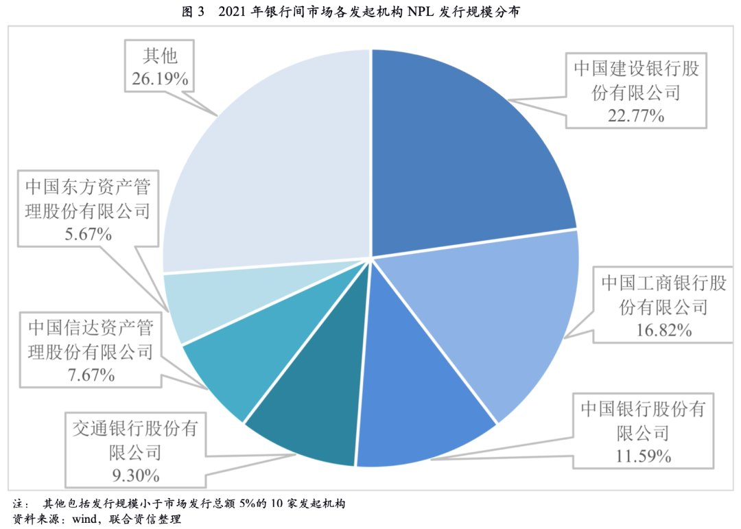 大型國有商業銀行為銀行間公募市場NPL產品發行主力,其中發行量排名前三的是建設銀行、工商銀行和中國銀行,共發行153.50億元,占2021年不良資產證券化產品總發行規模51.18%。隨著2019年底,第三次不良資產證券化試點擴容,2020年以來,銀行間公募市場發起機構更趨多元化,發起機構新增資產管理公司和城市商業銀行。2021年,資產管理公司和城市商業銀行共發起3單NPL產品。