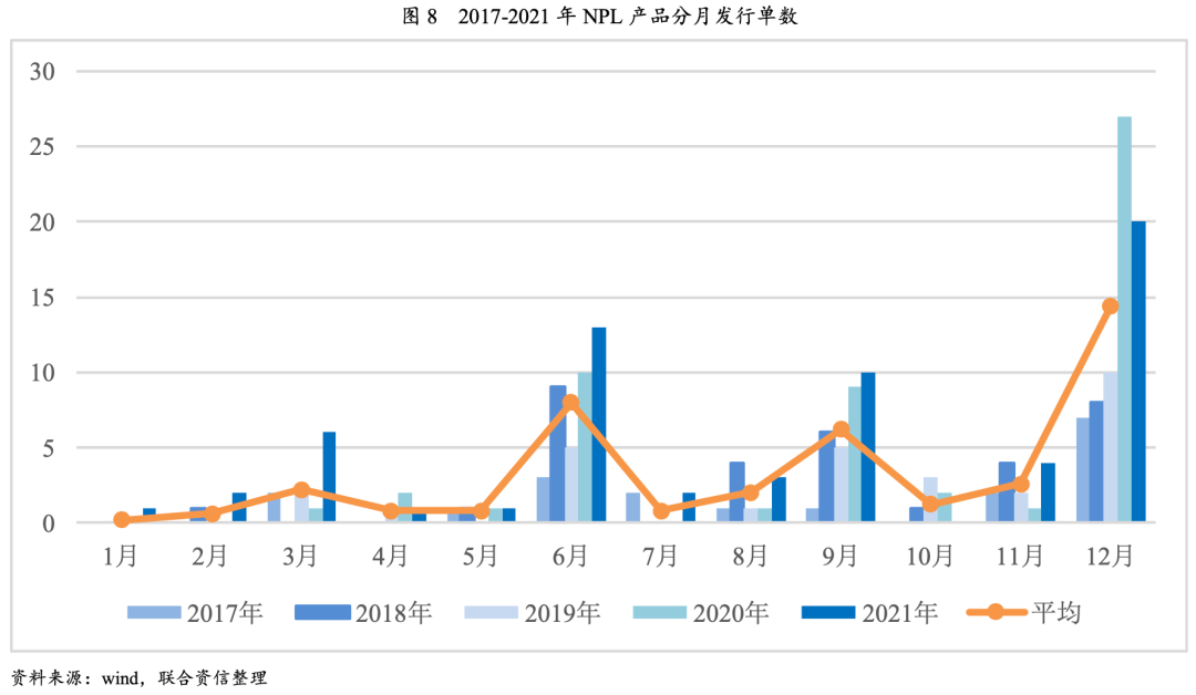 2016年-2021年共發行213單NPL產品,其中77單于12月發行。2021年共發行63單NPL產品,其中20單于12月發行。初于出表需求,NPL產品較多集中于年末發行。