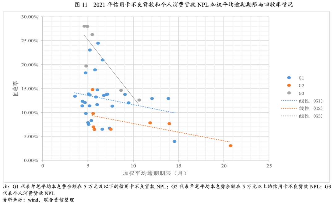 由于信用卡和消費類貸款一般無抵質押物作為擔保,回收難度較大,從進入不良到初始起算日的逾期期限和資產池分散度對回收水平的影響較大,逾期期限越短,分散度越高,回收率越高。如下圖所示,個人消費貸款NPL的分散度高于信用卡NPL,相似逾期期限的資產池,個人消費貸款NPL回收率更高。具有相似逾期期限的信用卡不良貸款,分散度越高(筆均5萬以下)的資產池回收率越高。分散度相近的信用卡不良貸款,逾期期限越短,回收率越高。