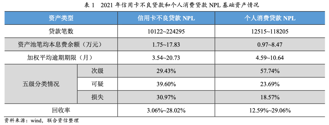 從五級分類情況來看,信用卡不良貸款NPL可疑類占比略高于次級類和損失類。從估值來看,2021年發行的此類NPL的單筆平均本息費余額區間為1.75萬元至17.83萬元,分散性好,基礎資產同質性高;最小加權平均逾期期限為3.54個月,最大加權平均逾期期限為20.73個月,入池資產逾期期限較短。2021年發行的信用卡和消費類NPL基礎資產一般情形下的回收率區間為3.06%至28.02%,回收率均值為11.97%。個人消費貸款NPL的資產池在分散度、逾期期限和五級分類情況等方面整體優于信用卡不良NPL,回收率表現整體優于信用卡不良貸款,回收率區間為12.59%至29.06%,回收率均值為21.79%。