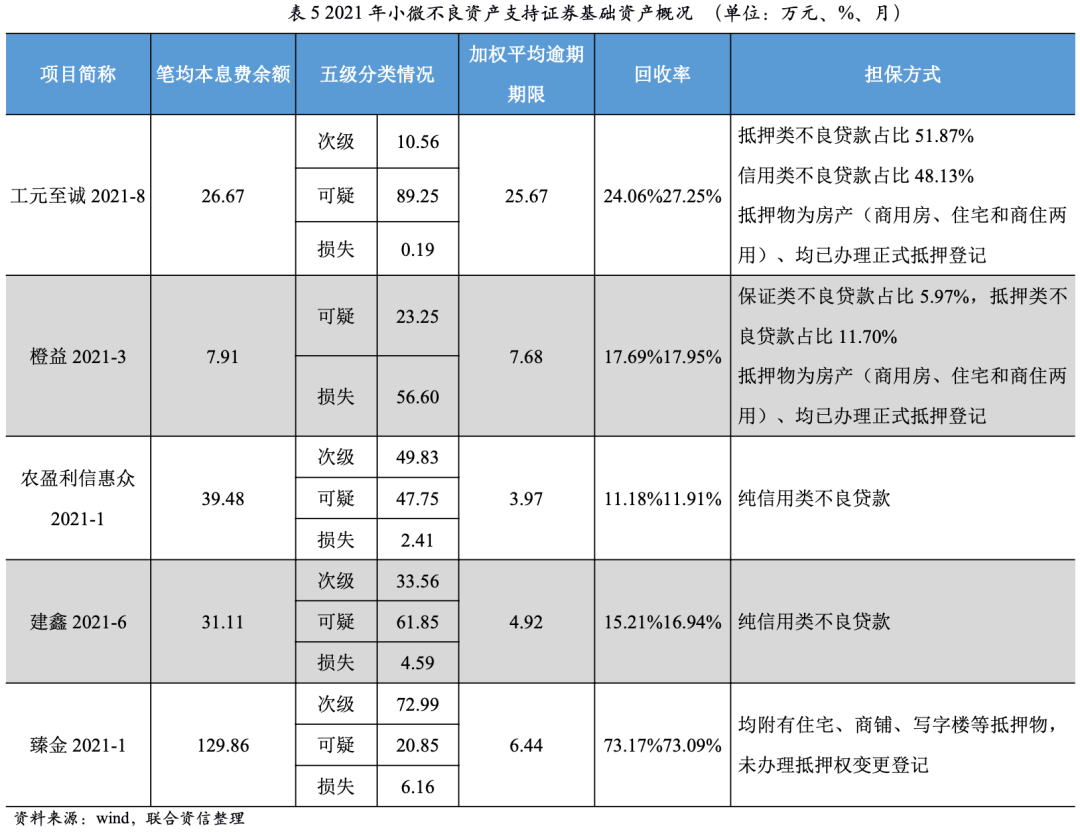 2021年,共發行5單小微不良資產支持證券,證券發行規模6.79億元,僅占總發行規模的2.26%,基礎資產未償本息費余額36.88億元。從擔保方式來看,基礎資產涉及的擔保方式較為多樣,包括抵押、保證、質押等多種擔保方式,抵押物多以不動產為主。入池不良資產貸款單筆平均本息費余額分布在7.91萬元-129.86萬元,筆均本息費余額波動較大,入池資產同質性較低。基礎資產附帶的抵押物的表現能力對回收估值水平影響較大,入池資產均附帶抵押物的小微NPL產品回收率達70%多,純信用類小微不良貸款回收率在10%-20%。