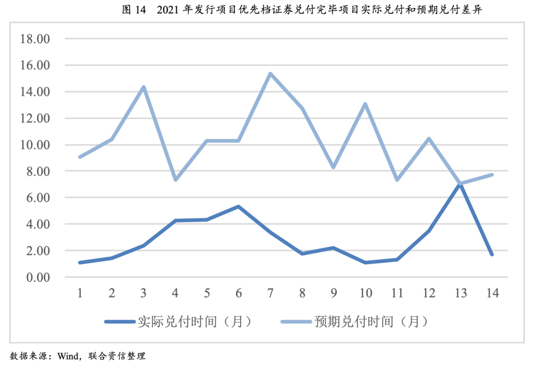 以2021年新發行不良ABS項目為例,截至2021年底,本年度新發行且優先檔證券已兌付完畢的不良ABS項目中,優先檔證券的實際到期期限絕大多數短于預期到期期限,實際到期日平均早于預期到期日半年多。