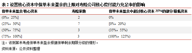 (ii) 計入核心資本的保單未來盈余不得超過核心資本的35%,且根據保單剩余期限的不同,保單未來盈余將分別計入核心資本、附屬資本,該調整會在不同程度上降低壽險公司的核心償付能力充足率,大型壽險公司保單的未來盈余規模及其占核心資本的比重均較高,受相關政策影響較為明顯。