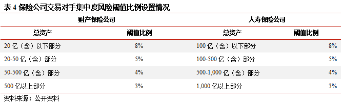 (3) 增加集中度風險最低資本要求,防止風險敞口過于集中。償二代二期工程增加了集中度風險最低資本要求:一是交易對手集中度風險,按保險公司持有同一交易對手的各類資產賬面價值總和超過總資產的閾值比例計算,閾值比例見下表,設置特征因子為0.4;二是大類資產集中度風險,保險公司持有權益類資產、其他金融資產、境外投資超過規定比例限制的,設置特征因子為0.2;三是房地產集中度風險,保險公司直接持有的投資性房地產和通過非基礎資產間接持有的房地產的賬面價值占保險公司總資產的比例超過25%時,應當對所有計量房地產價格風險的資產,設置特征因子為0.5。