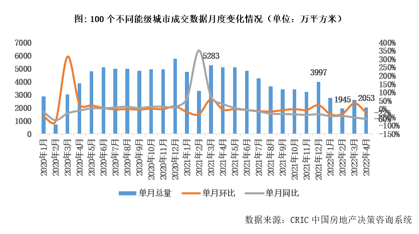 受疫情影響,房地產(chǎn)市場加速下行,百城成交同比跌幅擴至60%。2022年4月,100個重點監(jiān)測城市商品住宅成交2053萬平方米,環(huán)比下降22%,同比跌幅擴至60%。其中,一線城市成交同比下降48%,上海市場陷入停擺。二線城市成交同比下降60%,武漢、寧波、重慶等同比跌幅皆超70%。三四線城市暫以62%同比跌幅居首,徐州、東營、湖州等不僅成交持續(xù)低位運行,而且打折降價愈加頻繁。
