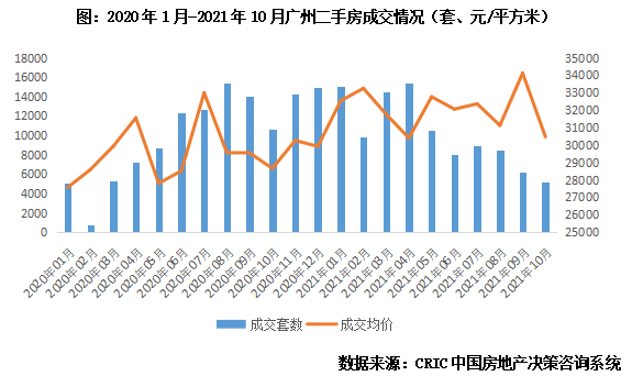 受到增值稅征免年限調(diào)整、房貸額度管控等影響,5月以來,廣州二手房成交量拾級而下。4月,廣州市9區(qū)住宅銷售增值稅征免年限由2年提高至5年,增加了二手房交易成本,導致5月以來掛牌量顯著下降,6月二手房成交罕見跌破1萬套,同比驟降34%,8月末廣州發(fā)布二手房指導價,9月二手房成交量應聲下跌,僅為6191套,同、環(huán)比分別下滑56%和27%,10月,二手房成交環(huán)比繼續(xù)跌16%。