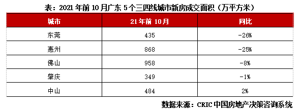 廣東其他三四線城市前10月新房成交跌多漲少,東莞、惠州累計跌幅超過25%。5個廣東城市中,除中山前10月新房成交同比微增2%外,其余4個城市成交規(guī)模均不及去年同期,東莞、佛山、東莞累計跌幅居前,作為環(huán)廣深城市,其市場走勢也和核心城市有所趨同。