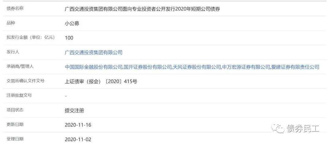 1、廣西交通投資集團(tuán)有限公司于2020年11月17日提交的面向?qū)I(yè)投資者公開發(fā)行2020年短期公司債券被終止,擬發(fā)行金額為100億元。廣西交通投資集團(tuán)有限公司的實(shí)際控制人為廣西壯族自治區(qū)國資委,主體信用評級為AAA(中誠信國際、大公國際和聯(lián)合資信),目前存續(xù)債券金額為244.70億元,存續(xù)債券只數(shù)20只,存續(xù)債券產(chǎn)品包括公司債券、企業(yè)債券、債務(wù)融資工具和境外債。
