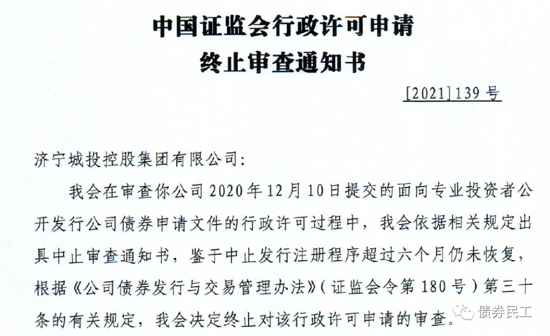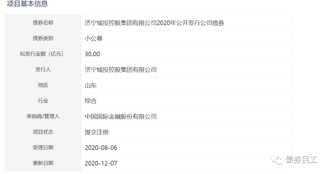 2、濟(jì)寧城投控股集團(tuán)有限公司于2020年12月10日提交的面向?qū)I(yè)投資者公開發(fā)行公司債券被終止,債券擬發(fā)行金額為30億元。濟(jì)寧城投控股集團(tuán)有限公司的實(shí)際控制人為濟(jì)寧市國資委,主體信用評級為AA+(中誠信國際、大公國際和中證鵬元),目前存續(xù)債券金額為154.50億元,存續(xù)債券只數(shù)17只,存續(xù)債券產(chǎn)品包括公司債券、企業(yè)債券和債務(wù)融資工具。