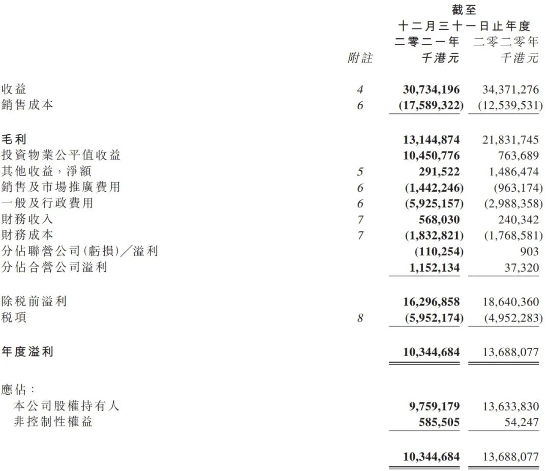 毛利下降更厲害,同比降幅約39.8%為131.4港元。可以看到2021年合生創展的銷售成本增加不少,同比增幅40.3%,高于銷售額增幅一倍左右。