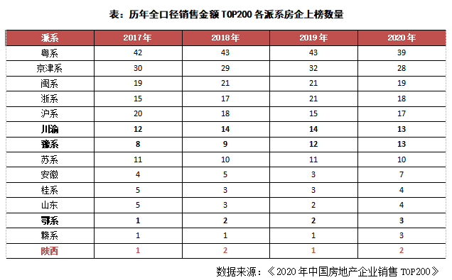 從陜西房企的發(fā)展情況來看,規(guī)模陜西房企數(shù)量較少,自2017年以來,僅有3家陜西房企在克而瑞《2020年中國房地產(chǎn)企業(yè)銷售TOP200排行榜》全口徑銷售金額榜單中出現(xiàn),分別是龍記泰信、天地源以及天朗地產(chǎn)。從上榜房企數(shù)量來看,陜西房企上榜數(shù)量較少,2017-2020年間每年最多2家企業(yè)上榜,明顯低于周邊川渝、豫系、鄂系等區(qū)域房企個數(shù)。