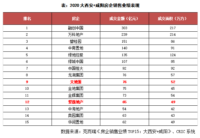 根據(jù)克而瑞西安機構(gòu)的數(shù)據(jù)來看,2020年大西安+咸陽房企銷售表現(xiàn)中,融創(chuàng)以303億元摘得榜首,萬科、碧桂園緊隨其后,在TOP15排行榜中,本土房企天地源和紫薇地產(chǎn)分別以76億元和65億元分別排名第9和第12名,整體來看,本土房企僅有2家高科系的身影,未來在強者恒強的情況下,西安本土小房企的擴張之路將更加困難。