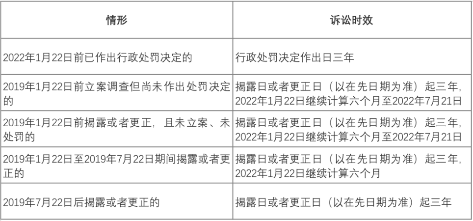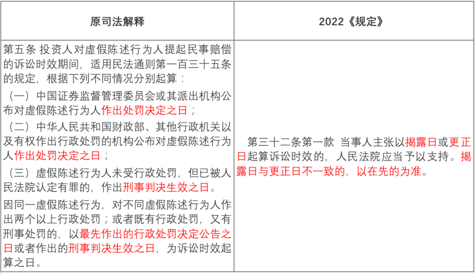 原司法解釋規定了行政或刑事前置程序,將行政處罰決定作出日或者刑事判決生效日作為訴訟時效的起算點。在廢除前置程序后,2022《規定》以揭露日或更正日二者在先日作為訴訟時效起算點,訴訟時效起算日大幅提前。
