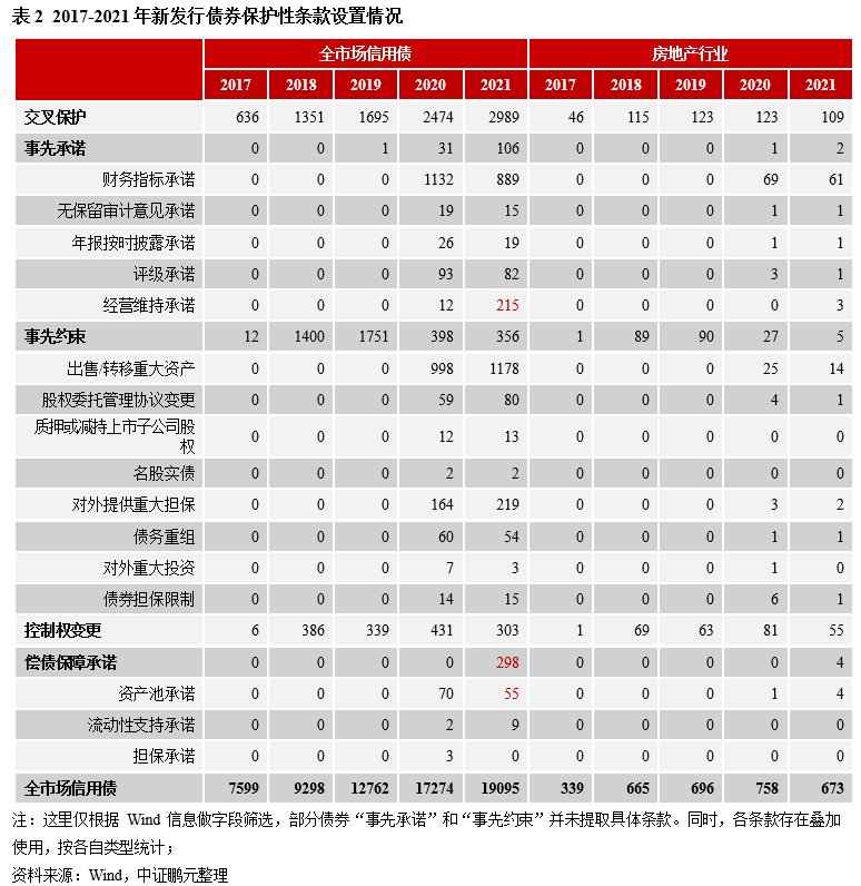 國內保護性條款發展情況:(1)發展概況:2016年銀行間市場首先推出《投資人保護條款范例》,并在2019年進行修訂。2017年交易所市場由中證協發布《公司債券投資者保護條款范例(征求意見稿)》,并在2021年8月由滬深交易所發布《公司債券發行上市審核業務指南第2號——投資者權益保護(參考文本)》。保護性條款旨在約束發行人日常經營行為,提高負債管理主動性,從而降低償債風險,保護持有人利益,同時,作為風險暴露時的重要處置依據。兩個市場在保護性條款方面的制度有一定的差異。銀行間市場對保護性條款的相關示范較為細致,且因出臺較早,2020年之前市場上已發行債券均參照銀行間相關規定。(2)保護性條款應用情況:第一,保護性條款應用和條款類型大幅提升。含持有人保護性條款的債券占比從2017年8.4%上升至2021年的21.8%,其中交叉保護條款應用最廣。第二,不同保護性條款可以疊加使用。第三,從市場分布看,含保護性條款的債券主要分布在銀行間市場但隨著交易所制度的完善,其債券應用比例有明顯上升,2021年為25%。具體看房地產行業,有保護性條款債券占地產行業債券的比例從2017年的13.6%增長到2021年的22%,以交叉保護條款為主,2021年AAA級主體發行的債券中約49%含保護性條款。(3)保護性條款觸發情況:截至2022年3月,已經出現債券違約的企業有198家,違約債券319只,其中涉及保護性條款的債券有69只,占比約21.6%。其中,房地產企業共計29家,違約債券125只,其中涉及違反保護性條款的有25只 ,涉及8家主體,在所有觸發保護性條款的樣本中占比均為32%,位列第一大行業。