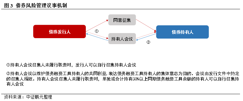 同意征集指引:同意征集,在境外市場中與債券置換、現金收購要約同為常見的負債主動管理工具,是集體行動機制的一種,與持有人會議存在一定相似性。(1)同意征集涉及發行人、全體持有人、存續期管理機構及其他相關中介機構。《同意征集指引》中列舉的可能影響持有人權力的重要事項,均在《銀行間債券市場非金融企業債務融資工具持有人會議規程(2020版)》中特別議案范圍內。(2)《置換業務指引》對同意征集操作做出詳細規定,主要包括關鍵時點、披露信息要求及表決生效標準。其中,持有本期債務融資工具表決權超過總表決權數額 90%(最低標準)的持有人同意發行人的征集方案,本次同意征集方可生效。另外,在同意征集截止日前,單獨或合計持有 10%以上本期債務融資工具余額的持有人,書面反對發行人采用同意征集機制就本次事項征集持有人意見的,本次同意征集終結。(3)同意征集與持有人會議的異同點。相同點,主要體現在表決機制相同。二者都是面向全體持有人,需同意比例達到相關標準,才能實施審議事項,是集體行動機制的一種。通過的議案將對所有債券持有人生效,包括棄權或不同意的債券持有人。不同點體現在方案發起人不同,審議對象屬性不同,議案同意方式的差異,以及表決生效約定的靈活性的差異。另外,根據《同意征集指引》,同意征集和持有人會議觸發情形存在重疊的可能。(4)債券置換、債券展期與借新還舊的選擇。整體看,僅僅是短期流動性出現問題,造成短期償債壓力增加的企業,適合借新還舊,尤其是市場利率走低的時期。而債券展期或債券置換適合外部融資空間有限、需進行負債結構調整的企業,部分困境企業或出現困境債券置換。《置換業務指引》發布后,債券置換和債券展期的主要區別在于,債券規模、利率、決策等方面。在境內,對于困境企業來說,債券置換或與債券展期差異較小。