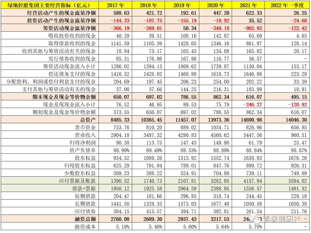 而從數(shù)據(jù)上看,2021年以來綠地的現(xiàn)金流均處于凈流出的狀態(tài)(2021年全年和2022年一季度分別凈流出246.27億元和120.92億元),這意味著對于綠地而言,其實際上已經(jīng)陷入現(xiàn)金流困局。
