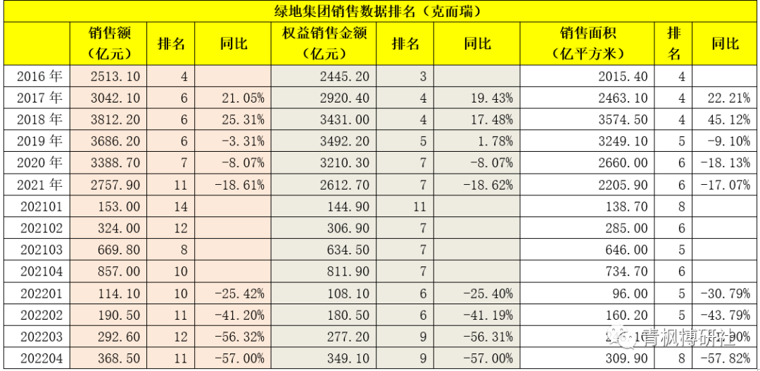 2、從數(shù)據(jù)上看,2019年以來,綠地便開始走下坡路。例如,2018年,綠地分別實現(xiàn)銷售額3812億元、銷售面積3575億平方,同比分別增長25.31%和45.12%,此后2019-2021年連續(xù)三年,銷售額與銷售面積均持續(xù)下滑。今年前四個月,綠地分別實現(xiàn)銷售額369億元、銷售面積 310億平方米,同比分別大幅下滑57%和57.82%,基本處于腰斬的狀態(tài)。