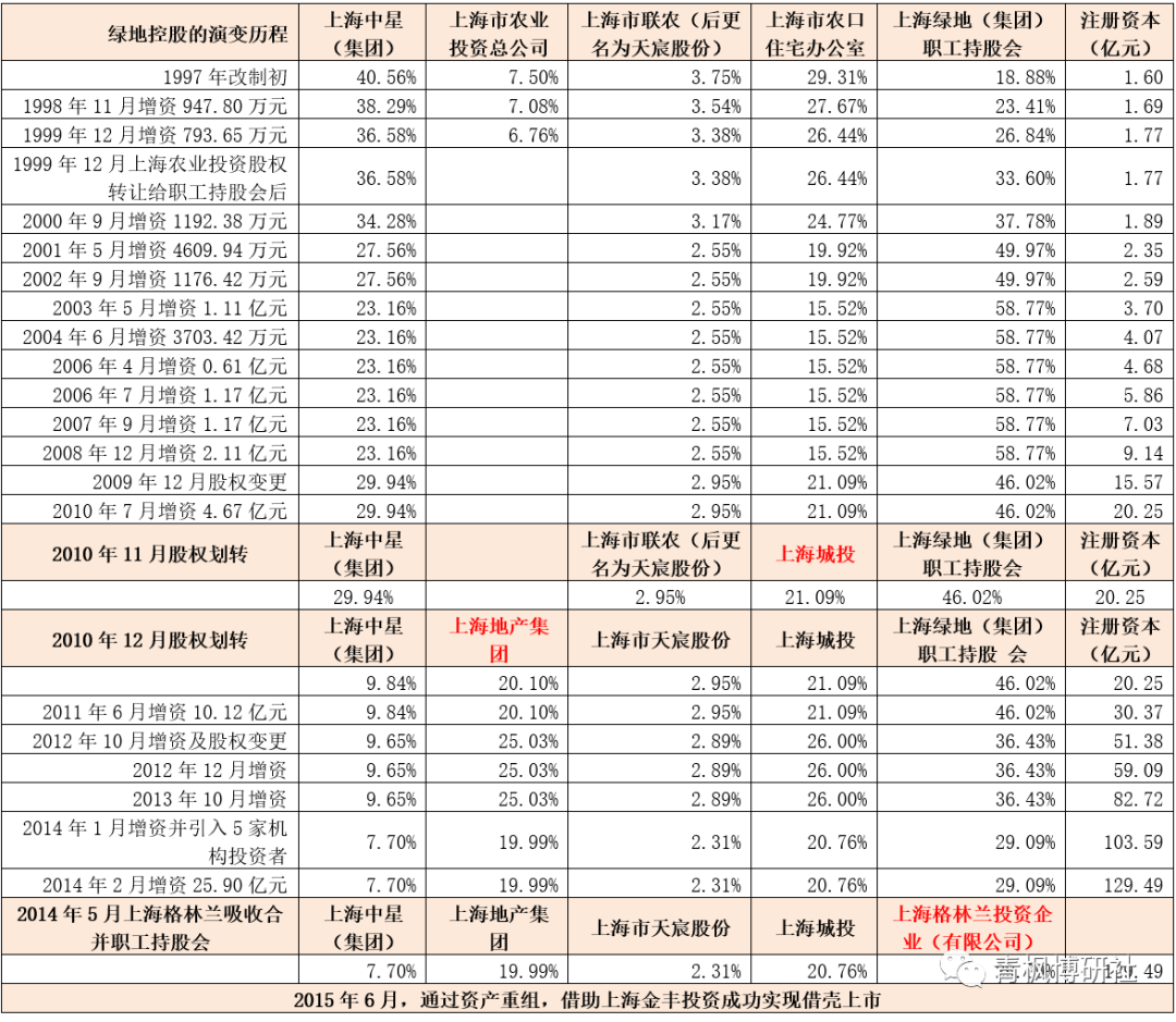 2、2013年8月,綠地通過在香港注冊的全資子公司,以29.96億港元的對價認(rèn)購盛高置地增發(fā)的普通股和無投票權(quán)的可兌換優(yōu)先股。此次交易完成后,綠地將持有盛高地擴大股東權(quán)益后的60%的股份,以實現(xiàn)最終控,隨后將盛高置地更名為綠地香港。在香港上市的做法進(jìn)一步向上海市政府施加了壓力,隨后綠地便趁著全國國企改革的春風(fēng),推動綠地增資并通過上海格林蘭投資規(guī)范職工持股會的運作,同時大幅壓降了上海地產(chǎn)集團和上海城投集團的持股比例。