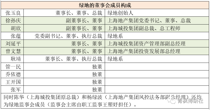 從綠地控股集團的董事會構(gòu)成來看,其11名董事中,分別有兩位來自上海城投集團(即胡欣和劉延平)和上海地產(chǎn)集團(即徐孫慶和曾文慧),也即上海市國資委旗下在綠地的董事會中派駐4位成員,占全部董事人數(shù)的1/3以上,超過衍生于綠地的3名董事(即張玉良、張?zhí)N和耿靖),這意味著上海國資委雖然對綠地董事會各議項實際上是有一定控制權(quán)(起碼有比較確定的否決權(quán)或重大影響),這大概也是市場把綠地視為國企的主要原因。