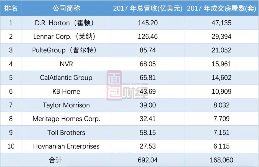 根據(jù)美國Builder雜志每年對全美房地產(chǎn)開發(fā)商的排行,我們可以看到美國開發(fā)商的營收和房屋成交情況,下表為2018年的TOP10: