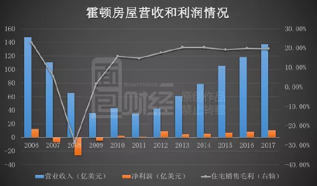 經(jīng)歷2008年金融危機后,霍頓房屋從2010年開始恢復(fù)盈利,而營收則從2012年開始進入增長通道,2017財年總營收為137.42億美元,與2006財年的歷史高點147.61億美元已十分接近。